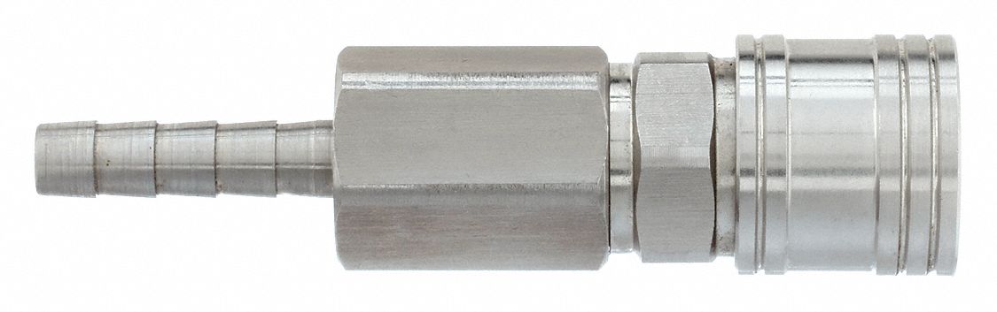 • Coupler Body,Asian Style Hi Flow Interchange,304 SS,Hose Barb Hose Connection,Barb Size 1/4,Body Size (In.) 1/4,Max. Air Flow (SCFM) 25,Max. Pressure (PSI) 400,Temp. Range 0 to 170 F,HNBR Seals,For Use With Hi Flow Plug,Weight Each (Oz.) 3.5,Features PTC,Used on End of Hose or Air Supply for Connection to Hose or Tool