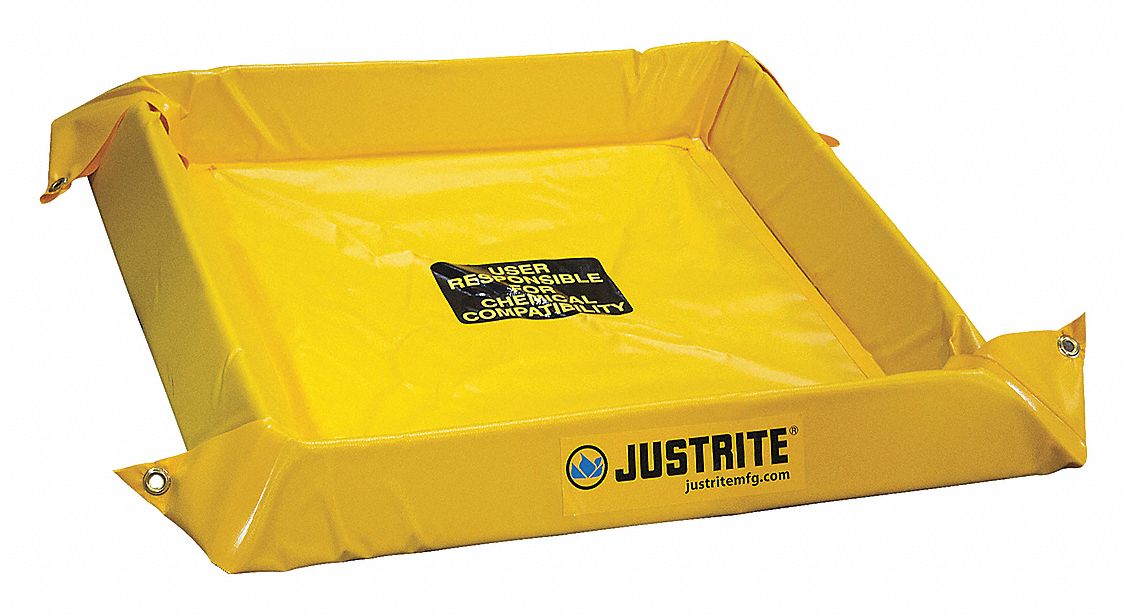 • This justrite rigid-lock quickberm is made of modified PVC-coated fabric and is black. It has a 355-gallon spill capacity. This containment berm measures 8 feet length x 6 feet width x 12 inch height.