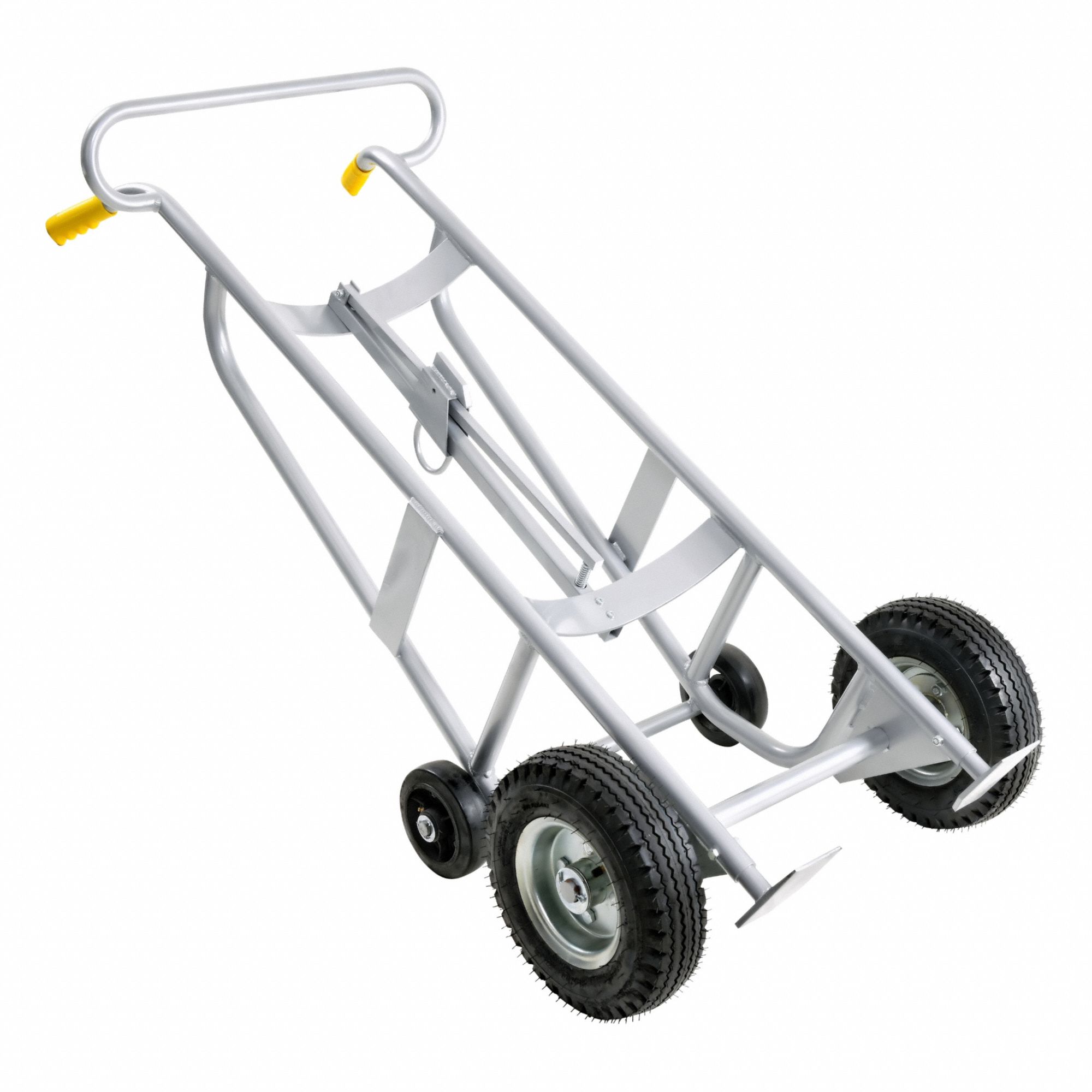 Drum Truck, Load Capacity 700 lb., Drum Capacity 30 to 85 gal., Overall Width 26 In., Overall Height 63 In., Material Aluminum, Colour Silver, For Use With Polyethylene and Steel Drums, Handle Type Dual and Curved, Wheel Material Pneumatic, Front Wheel Dia. 12 In.