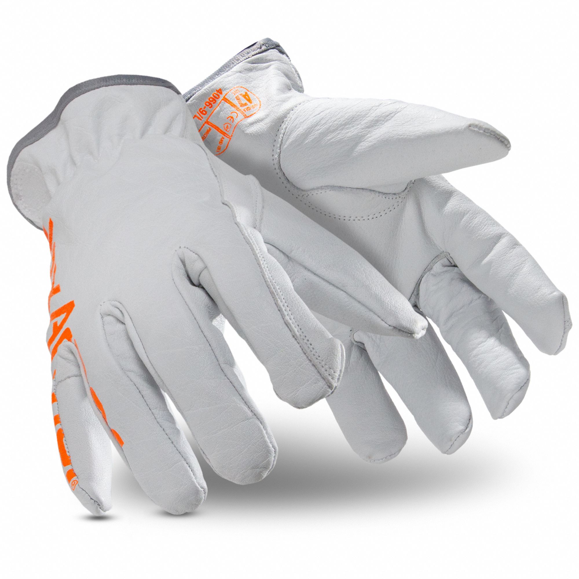 Gants en cuir gris/blancs HexArmor Bandit de petite taille composés de cuir de vache Corecept. Dotés de coutures en nylon et de pouces en aile. Homologués ANSI/ISEA niveau A5 résistance aux coupures/niveau 5 résistance aux perforations. Couverture intégrale des doigts avec manchettes, double paume avec manchettes de sécurité.