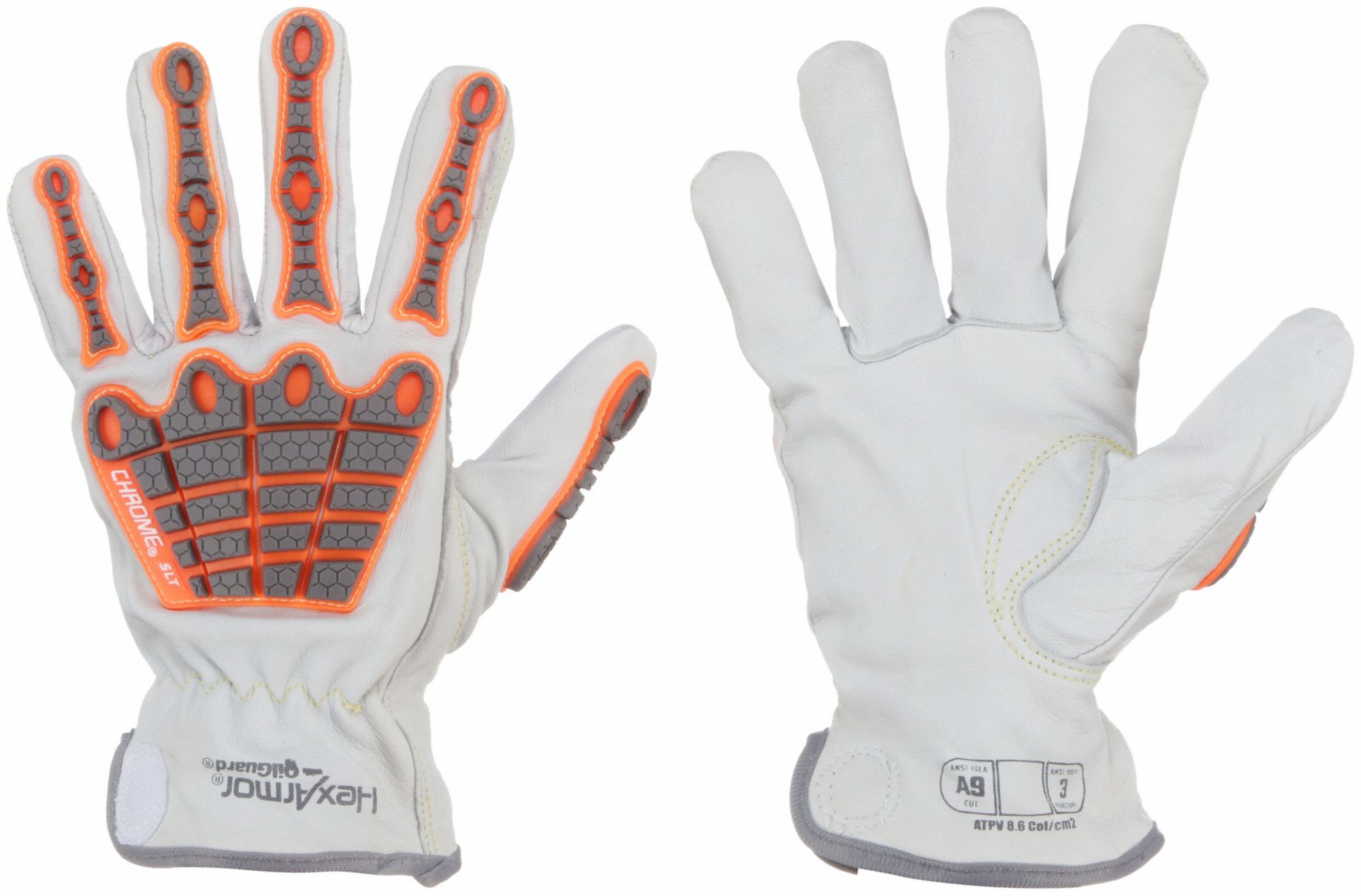 Ces gants en cuir gris HexArmor Chrome 4081 en taille G sont en SuperFabric et peau de chèvre. Ils ont aussi un revêtement en SuperFabric, des coutures en nylon et des pouces rapportés. Homologués ANSI/ISEA niveau A8 résistance aux coupures/niveau 4 résistance aux perforations. Ils recouvrent entièrement les doigts, présentent des manchettes froncées à enfiler et sont homologués EN 388 avec une cote de 4X13F. Pouces renforcés avec fourche renforcée et haute visibilité.