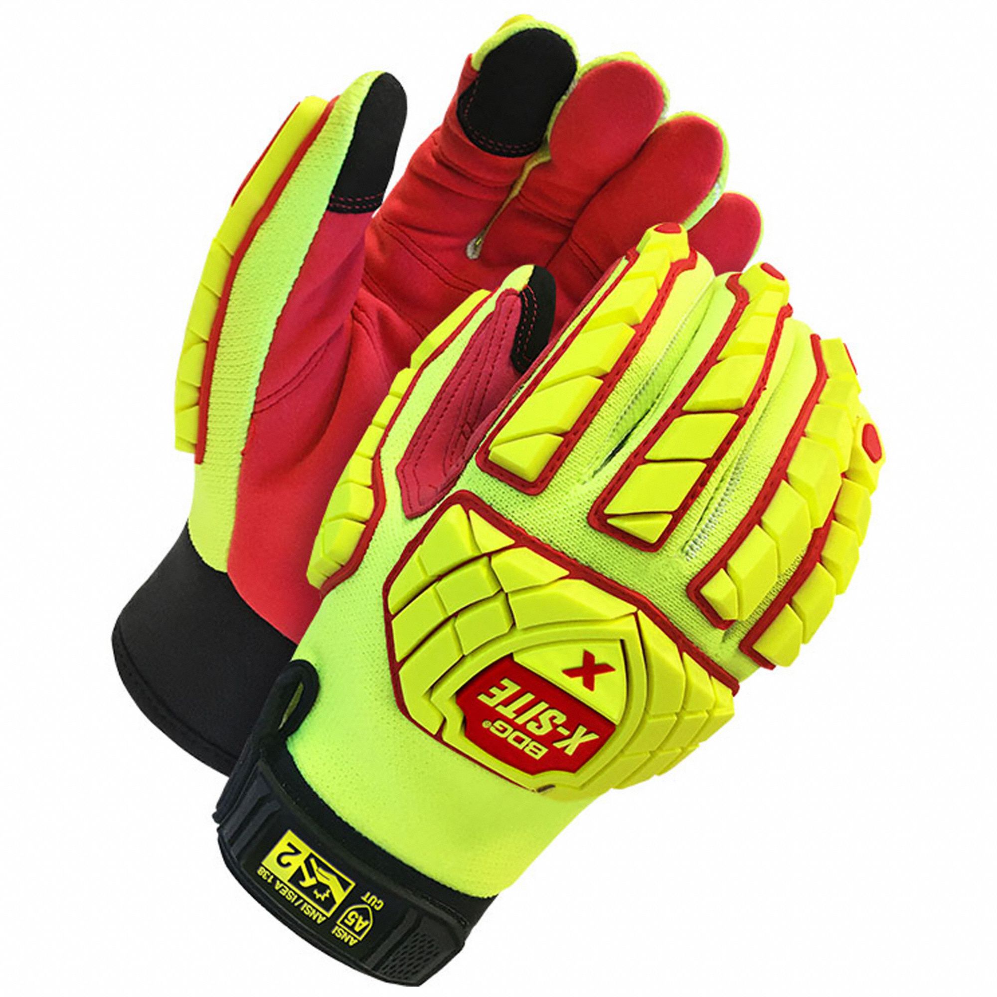 These red/yellow BDG X-SITE 20-1-10623 mechanic gloves are made with polyester, TPR, microfibre, and Spandex. In addition, they are uncoated, are abrasion-/impact-resistant, puncture-resistant. They are rated ANSI/ISEA Cut Level A5 /ANSI/ISEA Puncture Level 5. They are full-finger, have a hook-and-loop cuff. They feature reinforced index finger and thumb.