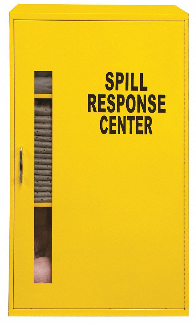 • This spill control cabinet includes 10 pillows, 2 3 x 4 inch socks, 25 pads, five disposal bags, 3 x 8 inch sock, goggles, pair of nitrile gloves, and 25 pads.