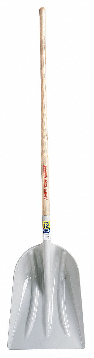 This #12 square point D-grip-handled grain and coal scoop has a 29-inch ash wood handle and a 15 x 18-3/4-inch stamped and aluminum blade. It has an overall length of 44 inches.