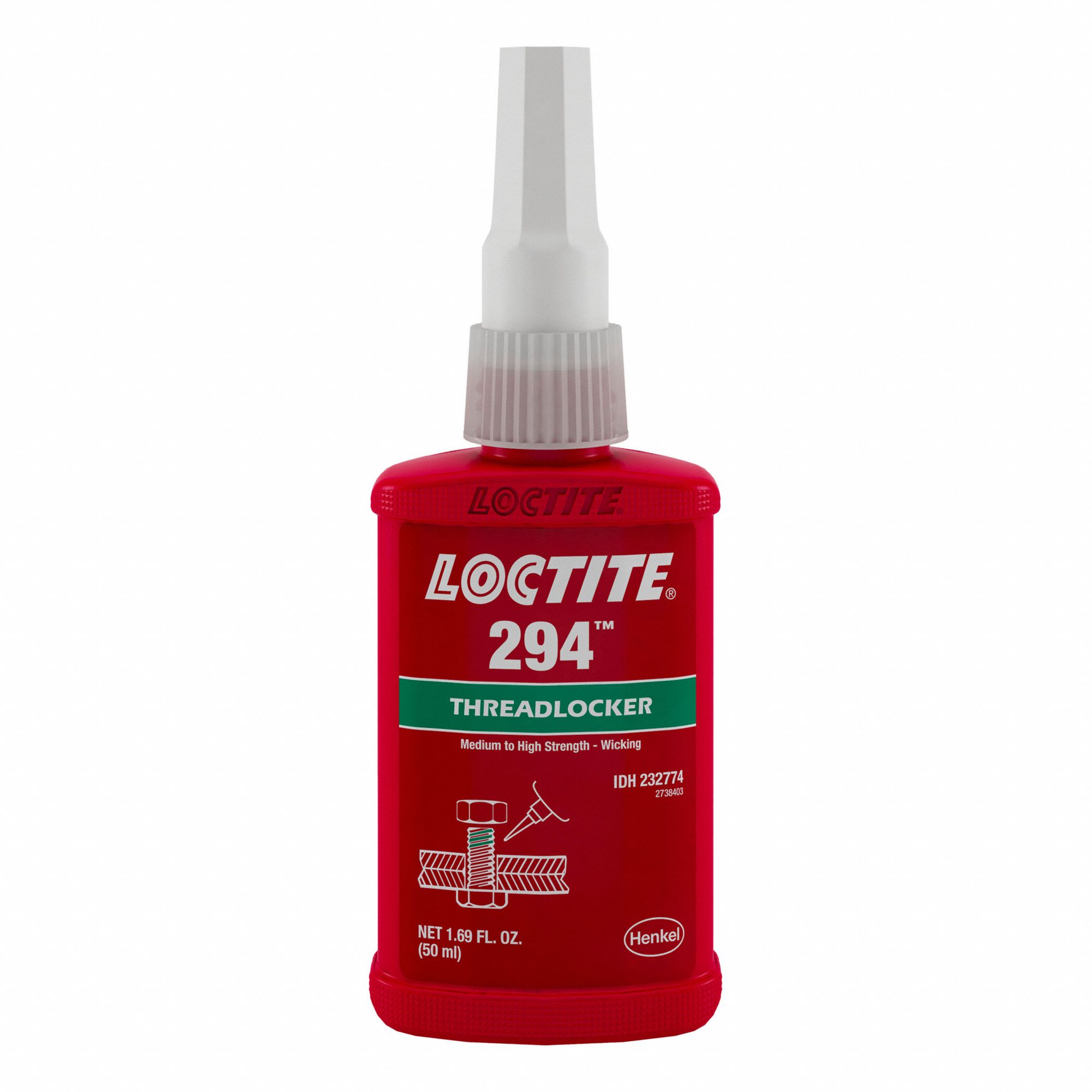 This high-strength threadlocker is red and comes in a 1.69 fluid ounce bottle. It meets the standards for ASTM D-5363, MIL-S-46163-A, UL Listed. This high-strength threadlocker has a working time of five minutes, and has a threadlocking strength of high, and is oil tolerant.