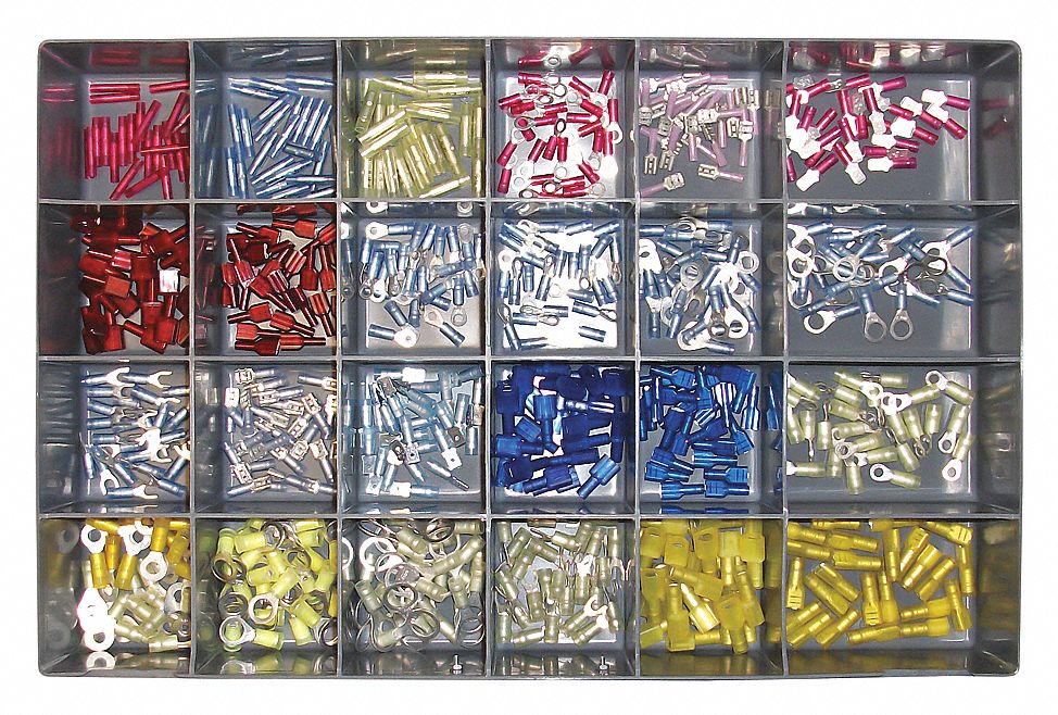 • Master shop assortment terminal kit contains 650 of the most popular automotive electrical terminals and accessories. Assorted gauges 22-18, 16-14, 12-10 and stud sizes #6-1/4 inches. Includes sturdy metal storage box.