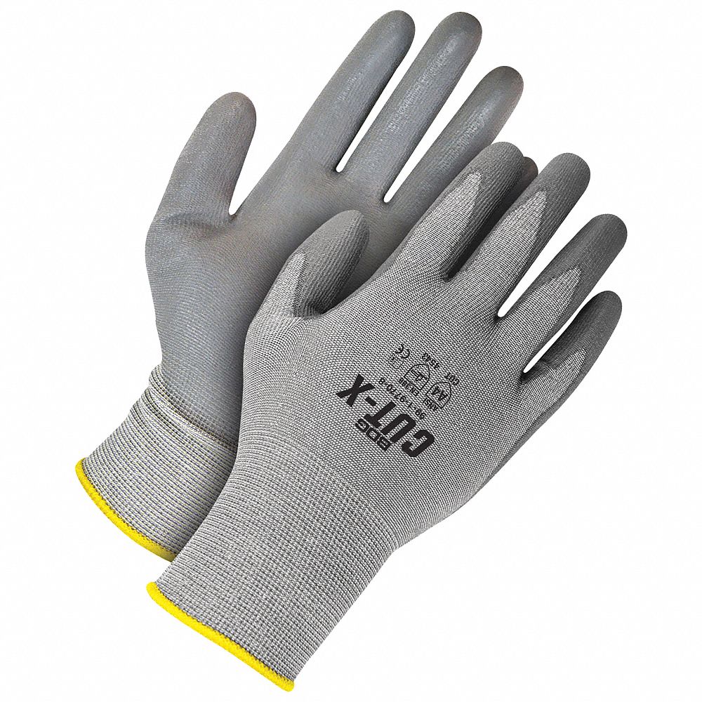These grey BDG Cut-X 99-1-9770 coated gloves are size X-large and are made with HPPE. In addition, they have a polyurethane coating and are rated ANSI/ISEA Cut Level A4. They are full-finger, have a knit cuff, and an EN 388 Rating of 4X43D.