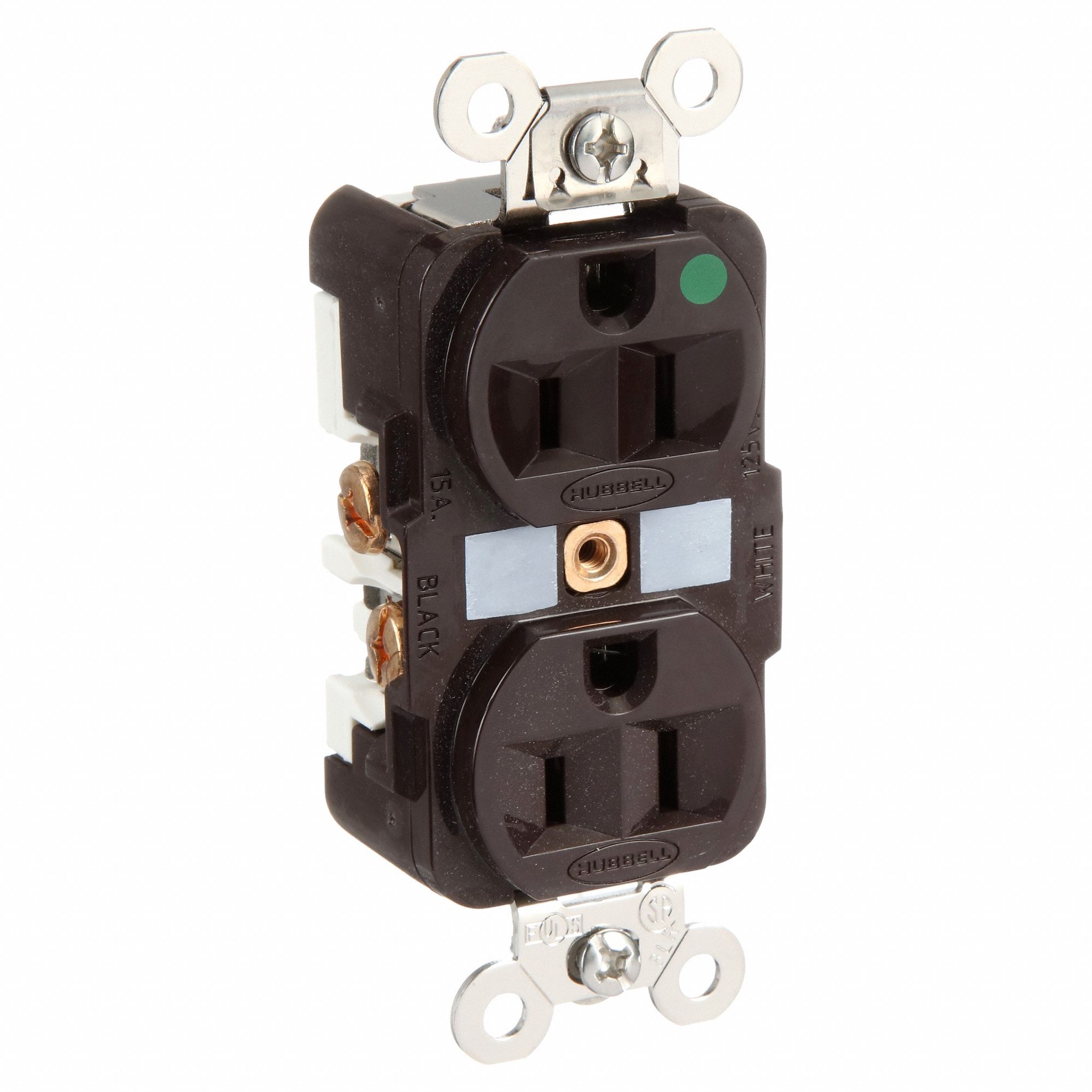 This receptacle has two poles, is single phase, a voltage rating of 125V AC, and an operating temperature of 167 Degrees F. It has the following resistance properties: impact resistant, plus it measures 1.2 inch depth, and includes grounding clip, mounting hardware, wall plate or weatherproof cover.