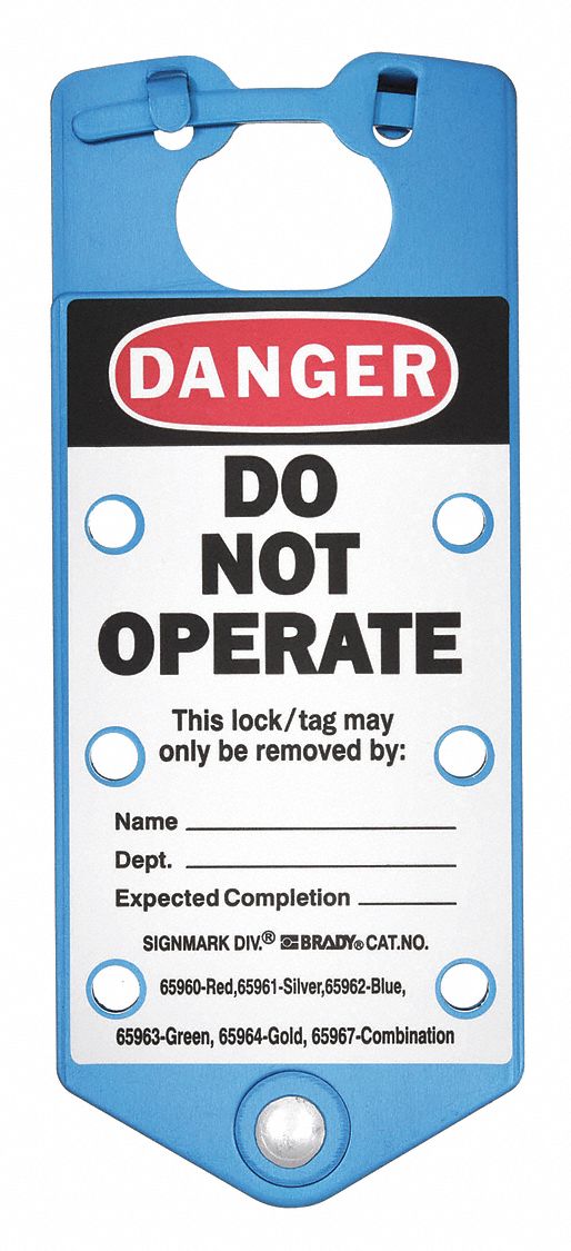 This labeled lockout hasp is made of aluminum and is blue. It is chemical resistant, meets the standards for RoHS and is in English. In addition, it measures 3 inch W, and includes write-on area. This labeled lockout hasp is for use with 5/16 inch diameter padlocks. The legend message is: Danger Do Not Operate, and the header reads: Danger.