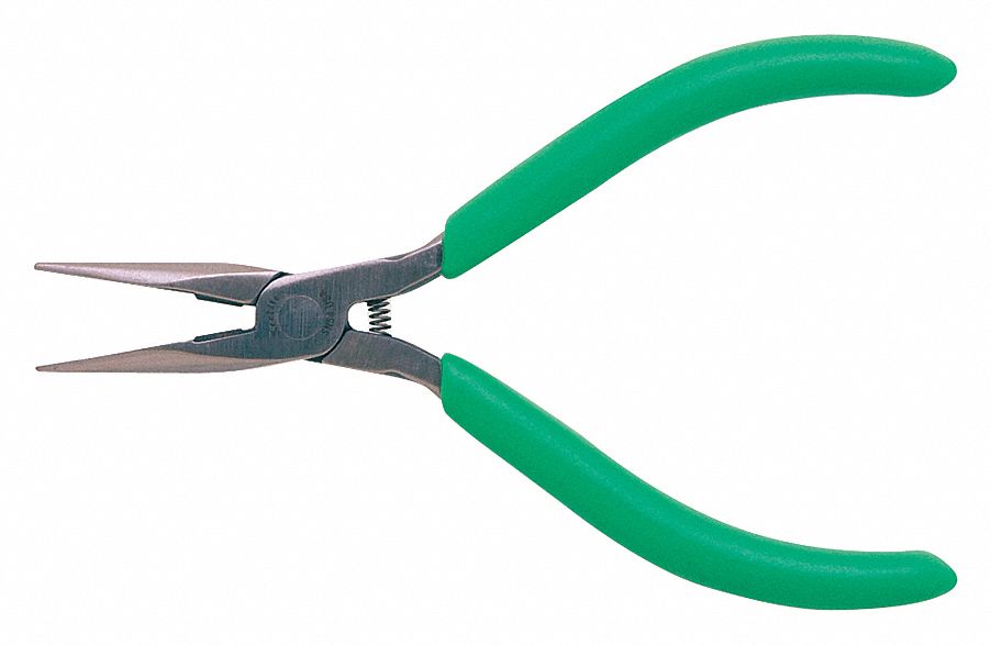 This nose pliers has a length of five inches. The handle is green. It features green cushion grips, long-nose side cutting pliers, serrated jaws, for general wire application and more and meets the standards for ESD.