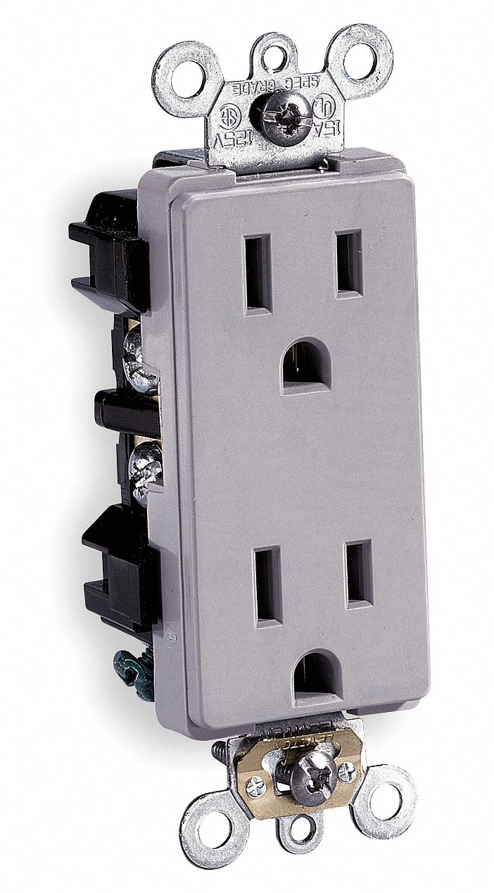 Straight blade receptacle. Side wire and Quickwire push-in terminal wiring options. Heavy-gauge zinc-plated steel mounting strap. Heavy-duty double-wipe brass contacts. UL Listed and CSA Certified.