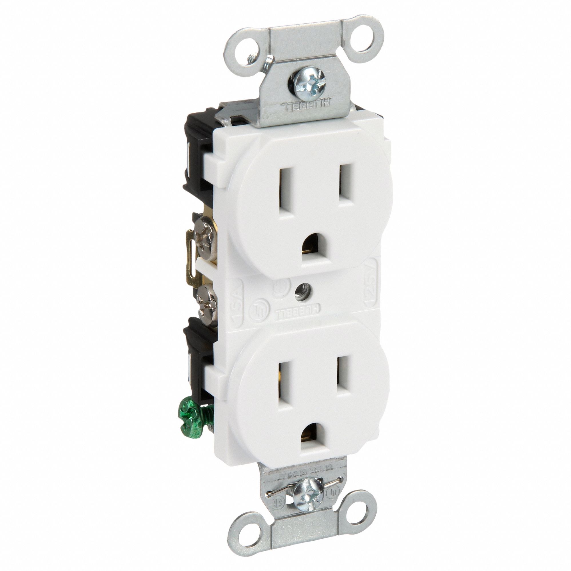 This receptacle has two poles, is single phase, a voltage rating of 125V AC, and an operating temperature of 167 Degrees F. It measures 1.1 inch depth, and includes grounding staple, mounting hardware, wall plate or weatherproof cover.