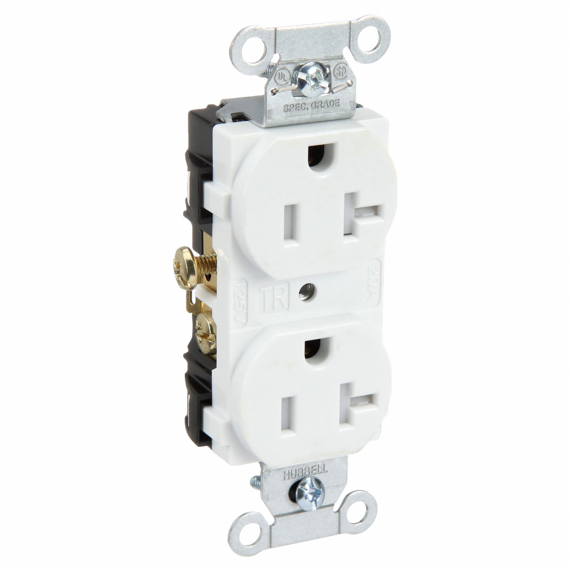 RECEPTACLE, DUPLEX, WHITE, 5-20R, 20 A, 125V AC, 2 POLE/3 WIRE, SCREW TERMINALS