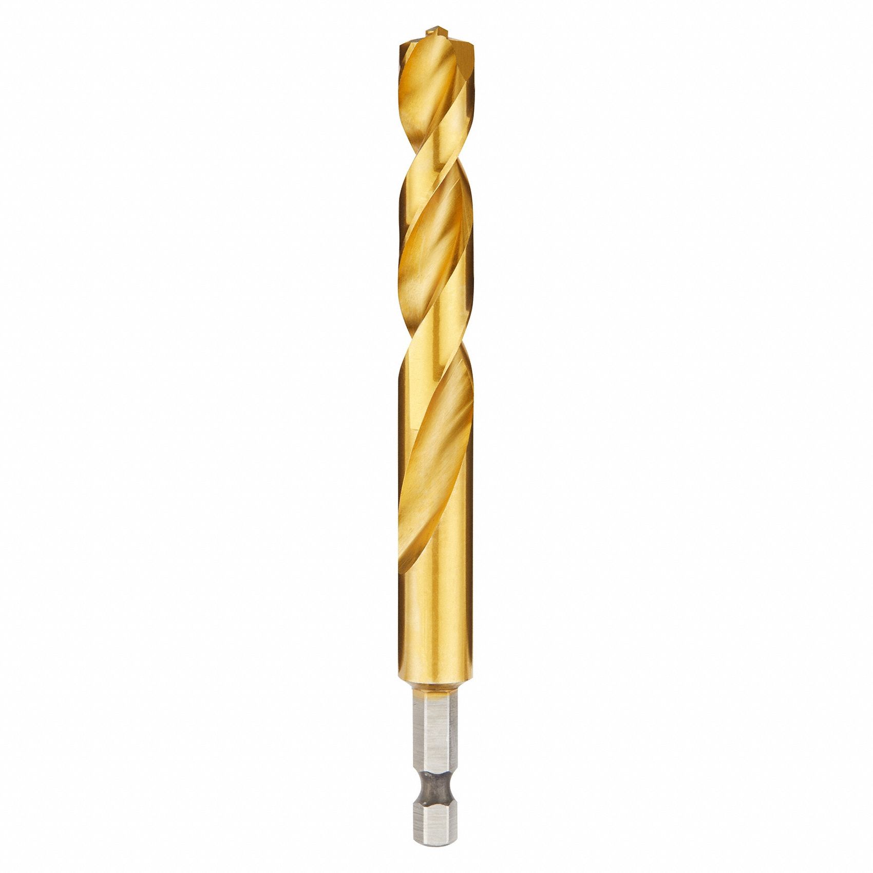 • Ce foret à tige hexagonale est en acier rapide. De plus, il a des mesures fractionnaires en po et une longueur de 2 1/2 po, une direction de coupe à droite et une finition en titane.
