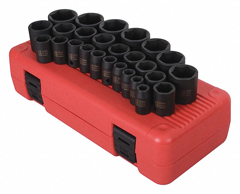 • This is a set of 17 SAE impact sockets with a drive size of 3/4 inches and a CR-MO alloy steel finish. Sizes included in this set are 1, 1 1/16, 1 1/8, 1 3/16, 1 1/4, 1 5/16, 1 3/8, 1 7/16, 1 1/2, 1 9/16, 1 5/8, 1 11/16, 1 3/4, 1 13/16, 1 7/8, 1 15/16, and 2 inches. These sockets come inside a heavy-duty blow moulded storage case.
